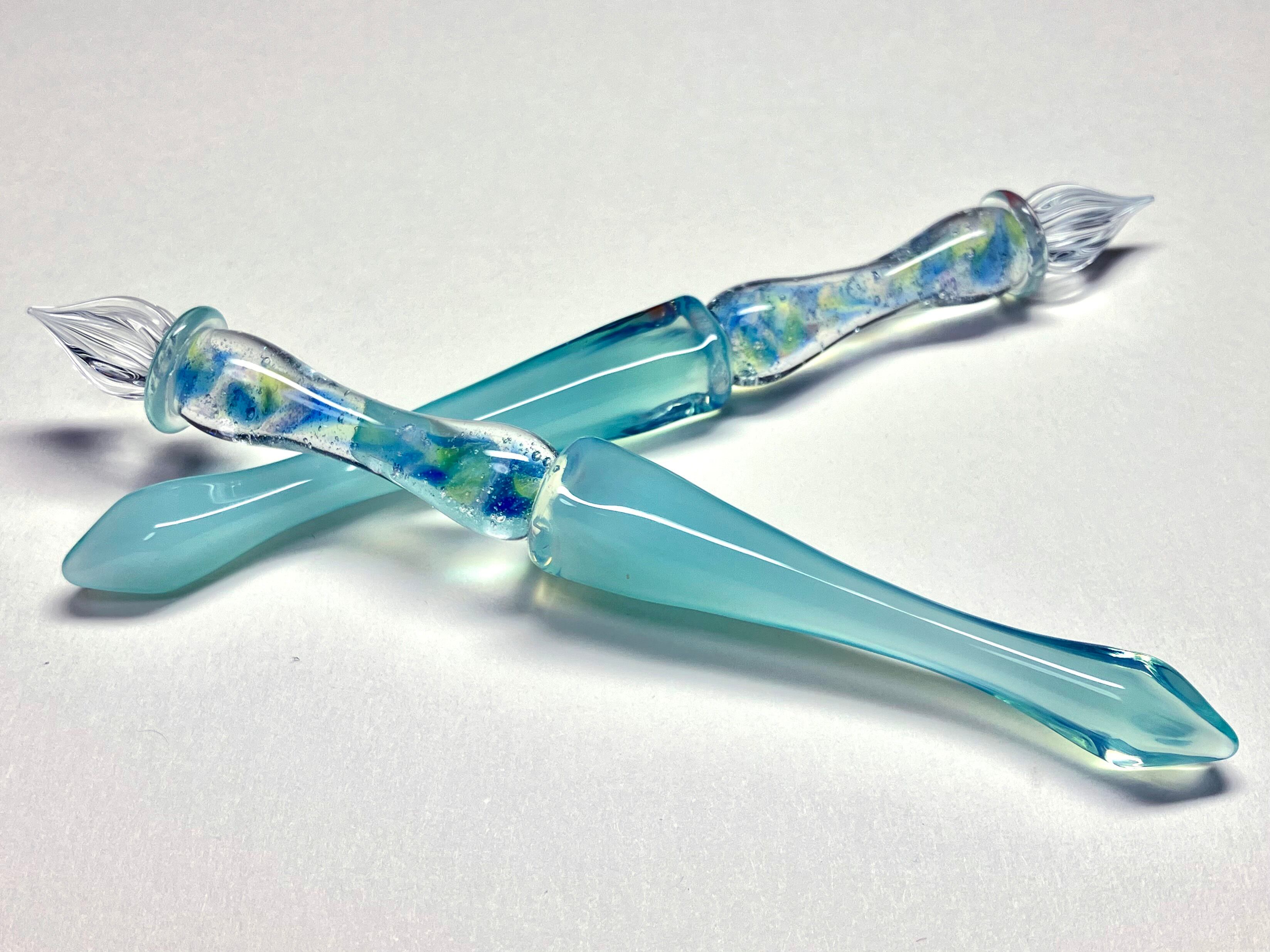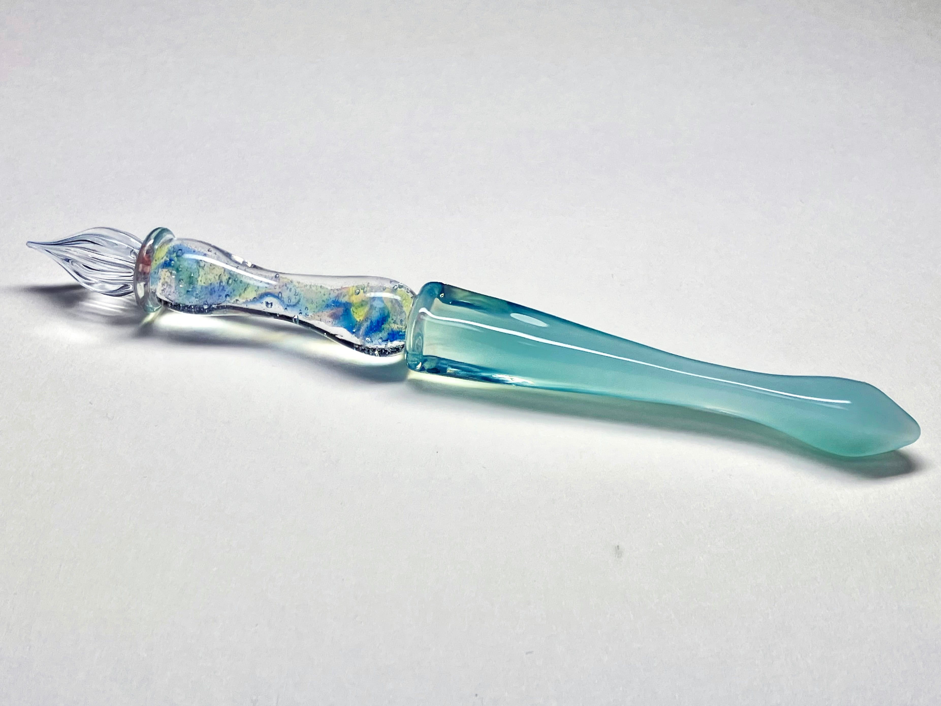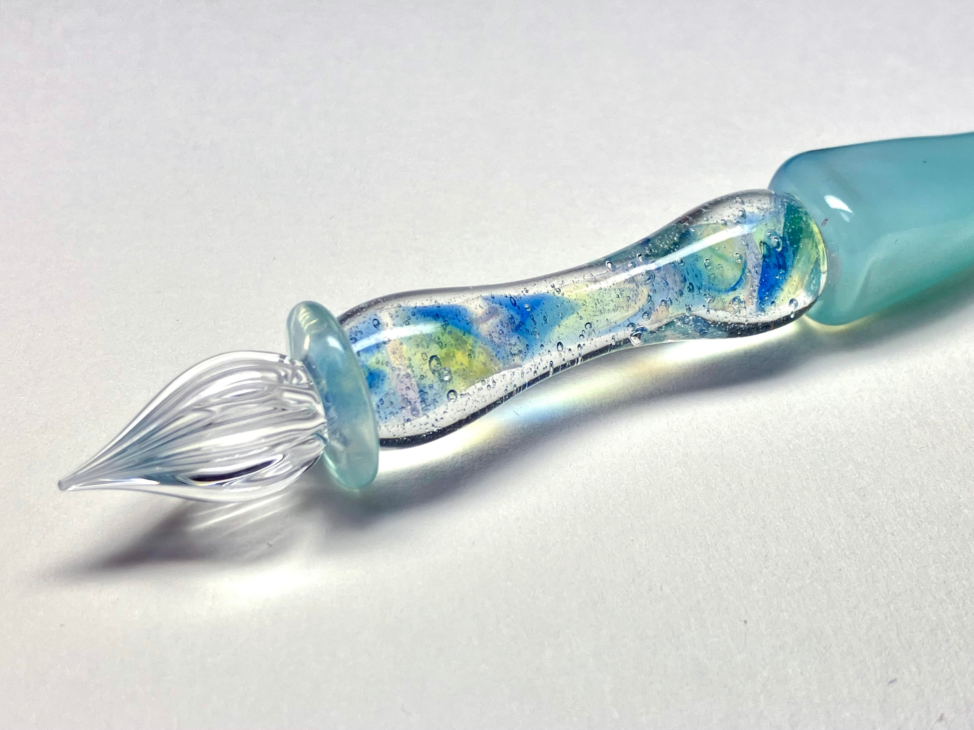 さまざまな色の粒の折り合いが可愛らしいデザインのガラスペンです。